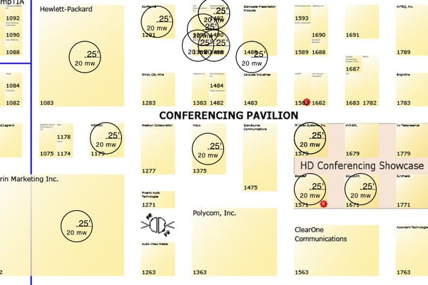 What should happen is that everyone turns down their transmitter power to the lowest possible setting. That way, coverage areas don’t overlap, and adjacent or every other adjacent booth is able to use the same frequency without interference. Then, you get something that looks like this: