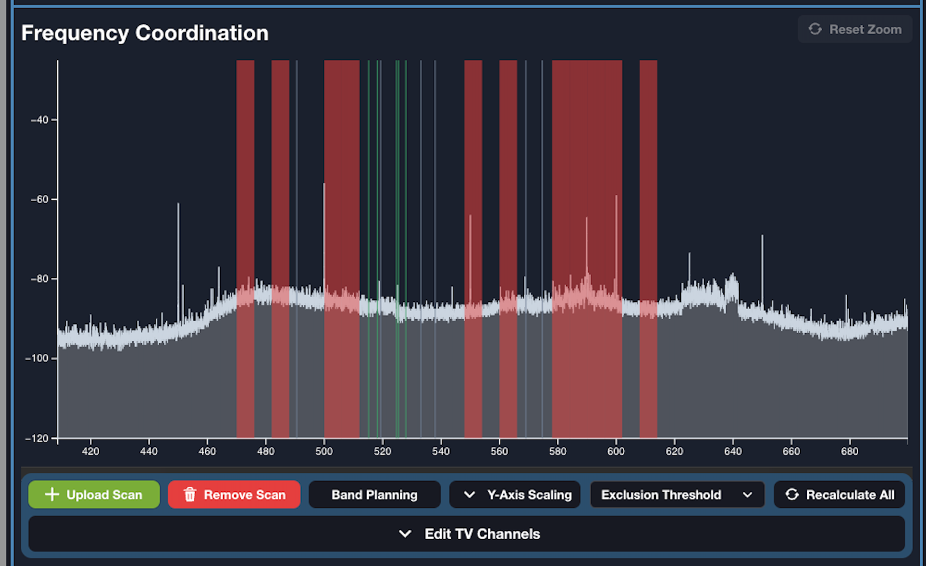 In the example graphic above, the red bands show DTV stations, the white trace shows the live RF scan of the room, and the green and blue vertical lines represent suggested safe frequencies for your wireless mics and IEMs. Notice that in the example, several of the white “peaks” (wireless microphones) have selected frequencies that are directly on top of DTV channels — which is exactly what causes real-world dropouts.