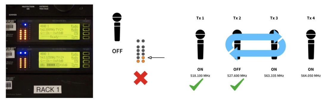 Once you load the clean frequencies into your receivers, turn on all your wireless mic receivers and each transmitter one by one, ensuring that, when a transmitter is off, that there is no RF signal present on the RF meters on the front of the receivers. If there is RF signal at the receiver when a transmitter is off, then you will need to choose another frequency from your coordination list and start the process over again from the first microphone.